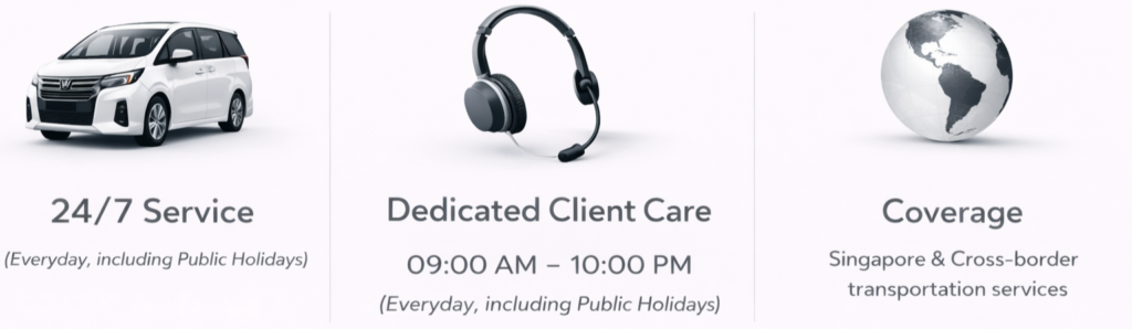Enjoy a seamless, comfortable journey with our private car service, offering direct transport from Singapore to destinations across Malaysia. Whether it’s for business, leisure, or family travel, we provide door-to-door pickup with professional drivers, spacious vehicles, and personalized service — ensuring a hassle-free ride across the border.
